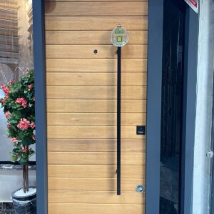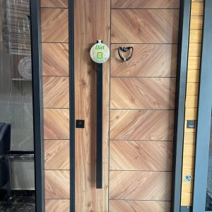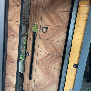 باب تركى ماركة ديمونت خشب طبيعى أستريبات Natural Wood بجزء ثابت زجاج سيكوريت وحديد فورفورجية عدد 5 كالون كالى سنتر لوك مقاس 130 سم
