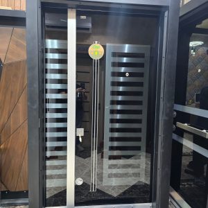 باب تركى ماركة ديمونت جراى عشوائى خطوط بجزء ثابت زجاج سيكوريت وحديد فورفورجية عدد 5 كالون كالى سنتر لوك مقاس 130 سم