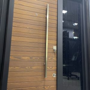 باب تركى ماركة ديمونت خشب طبيعى أستريبات Natural Wood بجزء ثابت زجاج سيكوريت وحديد فورفورجية عدد 5 كالون كالى سنتر لوك مقاس 160 سم